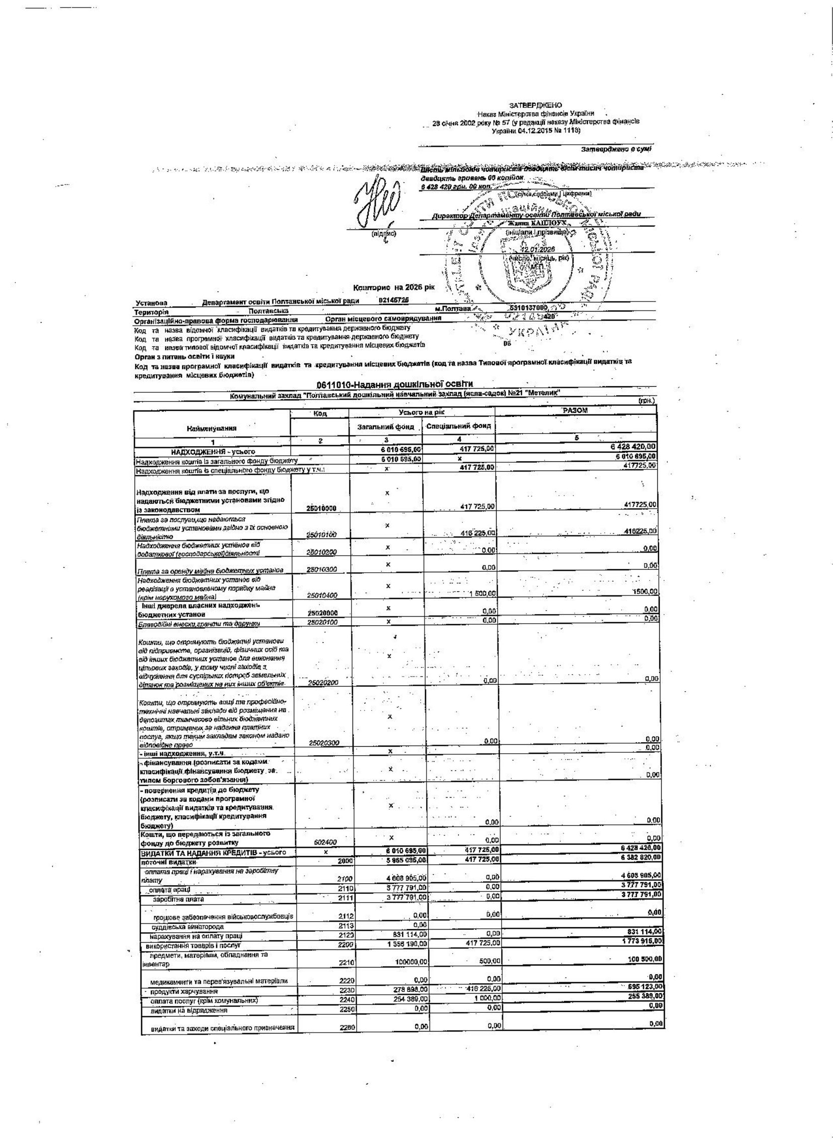 Кошторис на 2026 рік (12.01.2026)