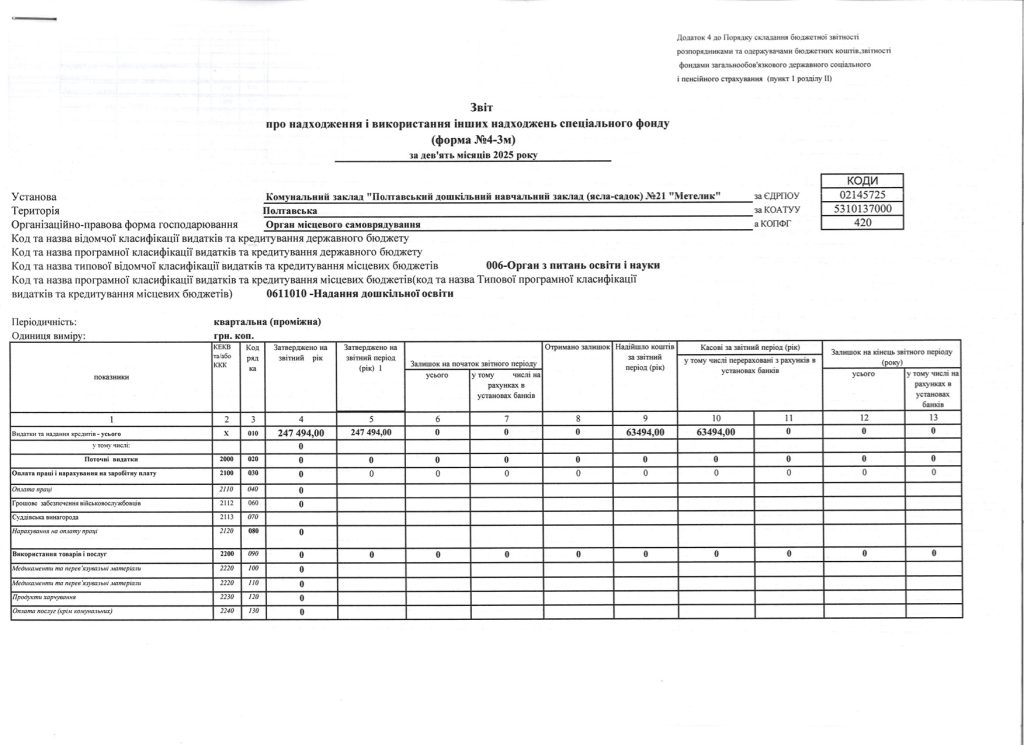 Звіт про надходження і використання інших надходжень спеціального фонду за девʼять місяців 2025 року