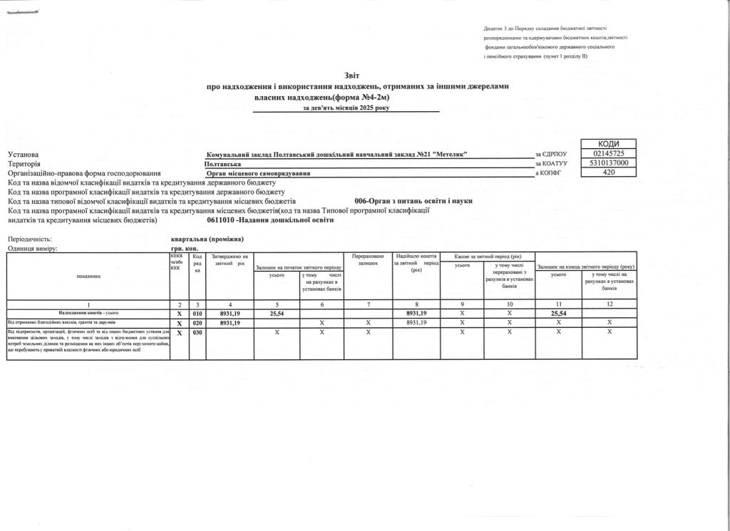 Звіт про надходження та використання коштів, отриманих за іншими джерелами власних надходжень, за девʼять місяців 2025 року