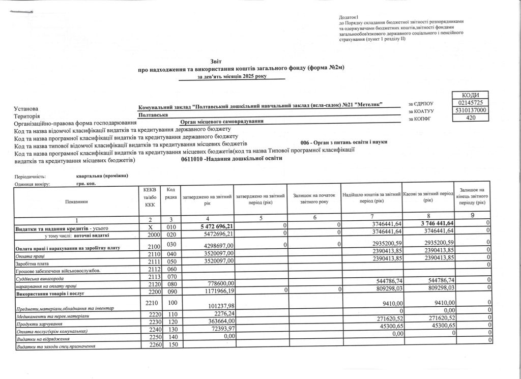 Звіт про надходження та використання коштів загального фонду за девʼять місяців 2025 року